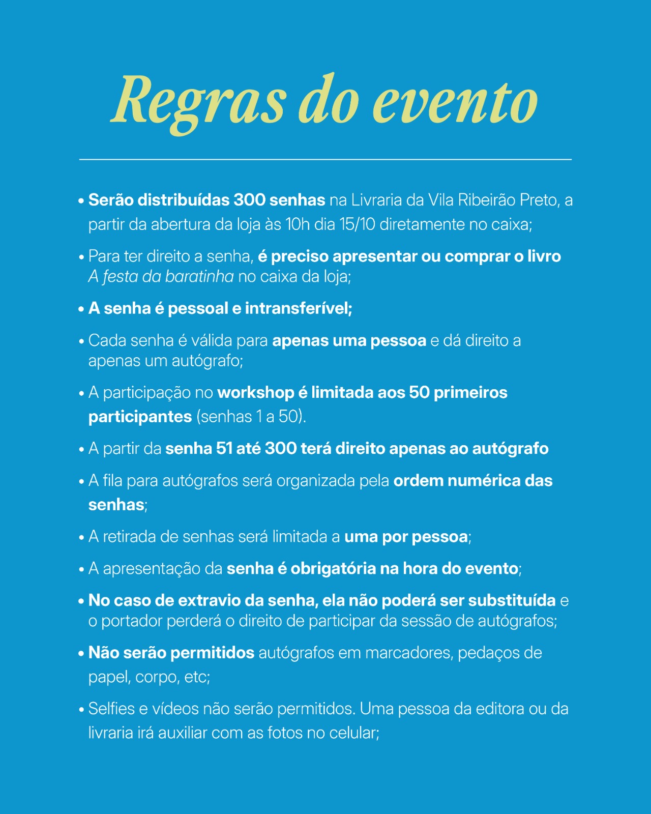 « Todos Eventos Adicionar aos Favoritos 18 de outubro das 11:00 às 15:00 A FESTA DA BARATINHA – LIVRO DE COLORIR – RAFAELLA TUMA – ED. SEXTANTE/GMT Fenômeno nas redes sociais com suas animações irreverentes, Rafaella Tuma estreia no mercado editorial com um livro de colorir cheio de humor. Em 20 desenhos, ela conta uma história que vai fazer você viajar no universo da Baratinha mais amada do Brasil. Tudo começa quando Tutuminha resolve dar uma festa e percebe que esqueceu um pequeno detalhe: os convidados! Ela parte, então, em busca da patota de amigos, com quem vai viver pequenas e grandes aventuras enquanto não chega o tão esperado dia.Mas uma penetra, sempre à espreita, tem enorme potencial para estragar a festa! Este livro inclui: • folha de acetato para proteger as páginas • 20 ilustrações com verso em branco • página para testar canetas • gramatura adequada para evitar danos ao papel • diversão garantida + Google Agenda+ Exportar iCal Compartilhar Detalhes: Data: 18 de outubro Hora: 11:00 às 15:00 Telefone: (16) 4042-4112 Local: Shopping Iguatemi – Ribeirão Preto Av.Luiz Eduardo de Toledo Prado, 900 Ribeirão Preto, São Paulo 14027-250 Brasil