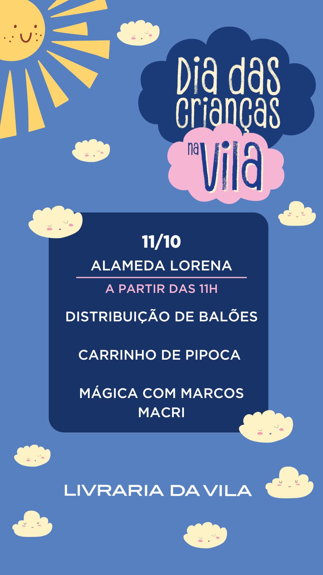 « Todos Eventos Adicionar aos Favoritos 11 de outubro das 11:00 às 16:00 DIA DAS CRIANÇAS NA VILA + Google Agenda+ Exportar iCal Compartilhar Detalhes: Data: 11 de outubro Hora: 11:00 às 16:00 Telefone: (11) 3062-1063 Local: Alameda Lorena Alameda Lorena, 1501 São Paulo, São Paulo 01424-005 Brasil