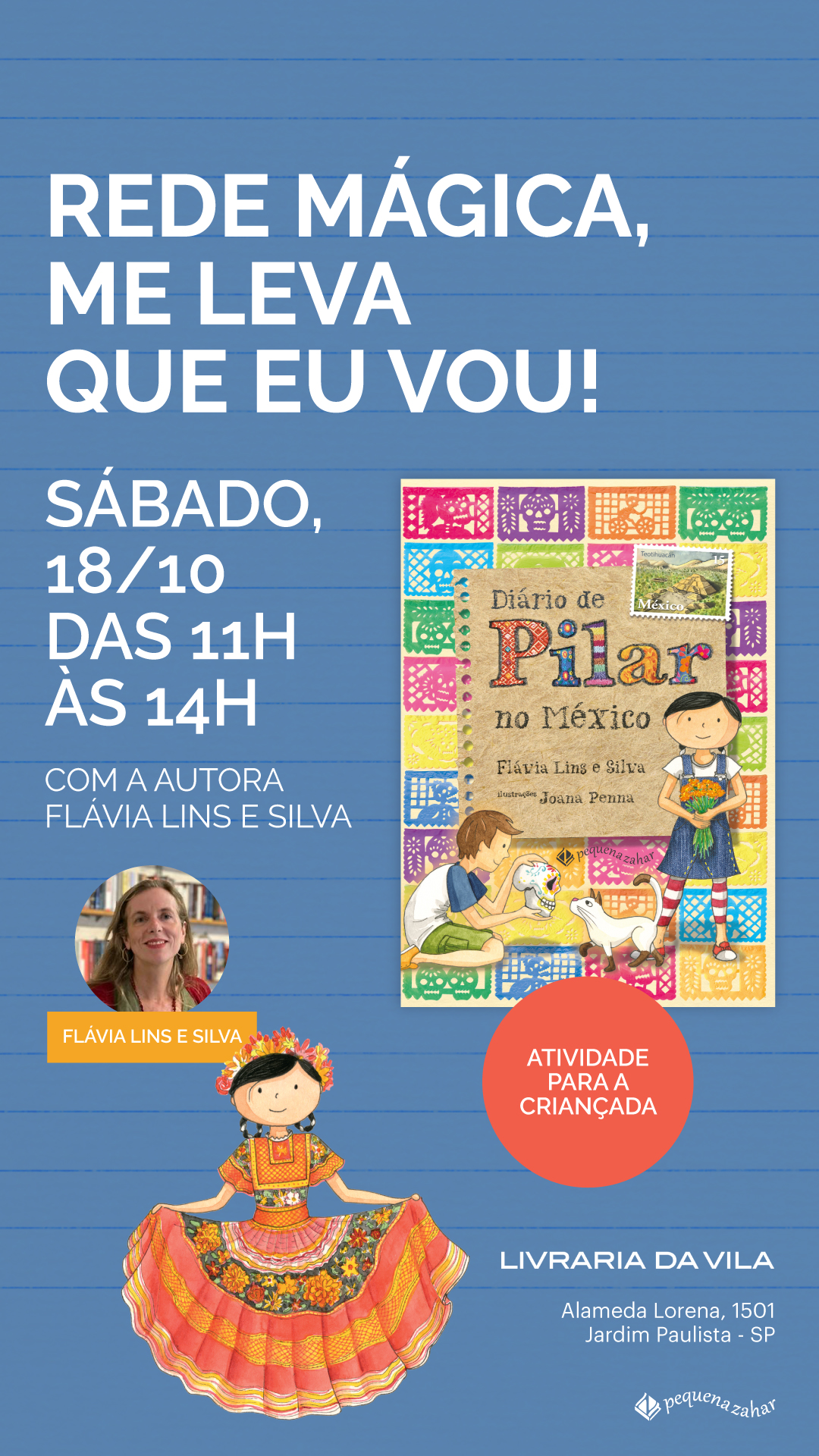 « Todos Eventos Adicionar aos Favoritos Este evento já passou. 18 de outubro das 11:00 às 14:00 DIÁRIO DE PILAR NO MÉXICO – FLÁVIA LINS E SILVA – PEQUENA ZAHAR Autor(a): Flávia Lins e Silva Editora: PEQUENA ZAHAR Pilar adora explorar o mundo, mas desta vez a viagem tem um gostinho especial: uma carta revela que ela tem uma avó no México! Surpresa e cheia de perguntas, ela embarca com Breno e Samba na rede mágica rumo à Cidade do México. O que ela não imagina é que, além de conhecer sua família, vai se envolver em um grande mistério. Entre encontros emocionantes com sua avó e tias paternas, Pilar mergulha na cultura mexicana: experimenta sabores autênticos, visita templos históricos, admira os murais de Diego Rivera e a originalidade de Frida Khalo, e se encanta com as celebrações do Dia dos Mortos.Mas a viagem toma um rumo inesperado quando uma importante escultura é roubada do Museu de Antropologia. Determinada, Pilar se une aos amigos para solucionar o mistério e acaba vivendo uma aventura inesquecível, repleta de história e diversão. Entre pistas enigmáticas e perseguições eletrizantes, eles viverão momentos que os transformarão em heróis locais. Indicado para leitores a partir de 9 anos. + Google Agenda+ Exportar iCal Compartilhar Detalhes: Data: 18 de outubro Hora: 11:00 às 14:00 Telefone: (11) 3062-1063 Local: Alameda Lorena Alameda Lorena, 1501 São Paulo, São Paulo 01424-005 Brasil