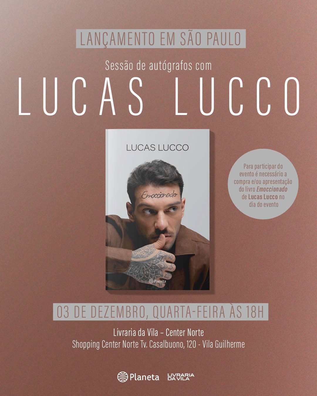 « Todos Eventos Adicionar aos Favoritos 3 de dezembro das 18:00 às 21:00 EMOCCIONADO – LUCAS LUCCO – ED. PLANETA (BRASIL) Autor(a): LUCAS LUCCO Editora: PLANETA (BRASIL) Viver sem intensidade É como vir pra esse mundo e não levar a sério É querer aprender sem sufocar o ego Entender o que é amar sem desvendar nenhum mistério Ser espontâneo e não ser sincero Dizer que ama só quando tá tudo certo É ouvir a música que mais gosta no volume zero. Escrevi este livro, mas, de certa forma, ele também me escreveu. São páginas nascidas de sentimentos silenciosos, que não precisaram ser ditos para existirem. Cada poema é um desabafo que rima, uma tentativa de traduzir o que, muitas vezes, é impossível explicar. Não é preciso ler tudo de uma vez. Abra uma página. Leia. Sinta. Reflita. Este livro é para quem sente, e sente muito. Espero que, entre essas palavras, você encontre algo que consiga traduzir o que carrega aí dentro. Quer me ouvir lendo para você? Aponte a câmera do celular para os QR Codes e assista aos vídeos em que recito cada poema. Até breve. A gente se encontra em algumas dessas linhas. + Google Agenda+ Exportar iCal Compartilhar Detalhes: Data: 3 de dezembro Hora: 18:00 às 21:00 Telefone: (11) 4210-1362 Local: Shopping Center Norte Travessa Casalbuono, 120 – Vila Guilherme São Paulo, São Paulo 02049-000