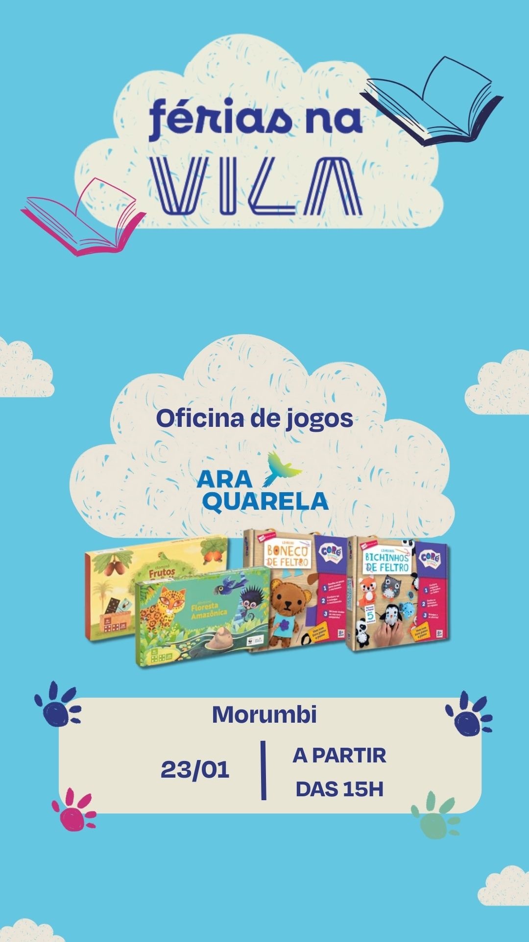 « Todos Eventos Adicionar aos Favoritos 23 de janeiro das 15:00 às 18:00 FÉRIAS NA VILA COM ARAQUARELA Oficina de jogos com Araquarela + Google Agenda+ Exportar iCal Compartilhar Detalhes: Data: 23 de janeiro Hora: 15:00 às 18:00 Telefone: 04707-900 Local: Shopping Morumbi Av. Roque Petroni Júnior, 1089 São Paulo, São Paulo 04833001 Brasil