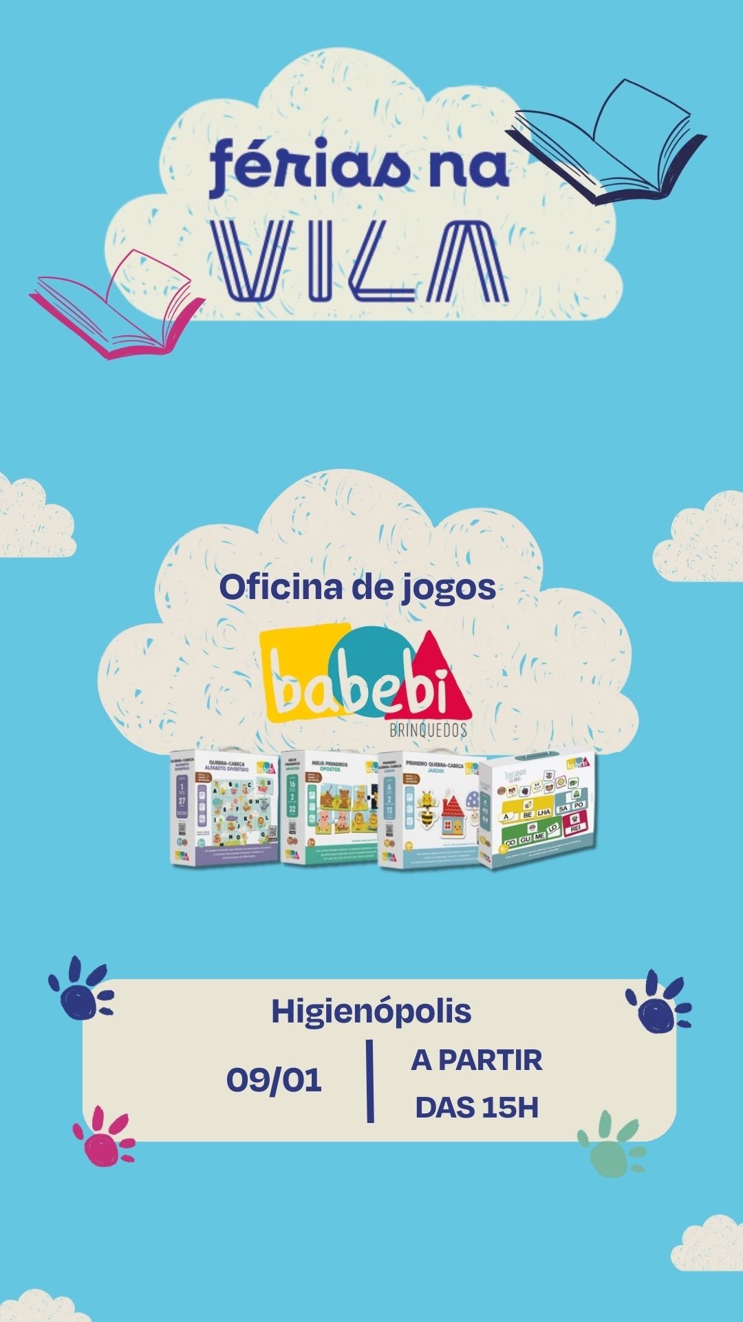 « Todos Eventos Adicionar aos Favoritos 9 de janeiro das 15:00 às 18:00 FÉRIAS NA VILA COM BABEBI BRINQUEDOS Oficina de jogos com Babebi + Google Agenda+ Exportar iCal Compartilhar Detalhes: Data: 9 de janeiro Hora: 15:00 às 18:00 Telefone: (11) 3660-0230 Local: Shopping Pátio Higienópolis Av. Higienópolis, 618 – Higienópolis São Paulo, SP 01238-000 Brasil