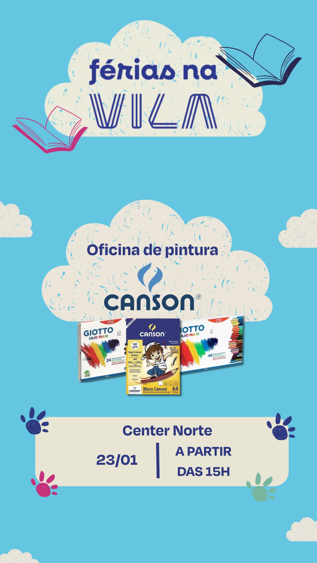 « Todos Eventos Adicionar aos Favoritos Este evento já passou. 23 de janeiro das 15:00 às 18:00 FÉRIAS NA VILA COM CANSON Oficina de pintura com Canson + Google Agenda+ Exportar iCal Compartilhar Detalhes: Data: 23 de janeiro Hora: 15:00 às 18:00 Telefone: (11) 4210-1362 Local: Shopping Center Norte Travessa Casalbuono, 120 – Vila Guilherme São Paulo, São Paulo 02049-000