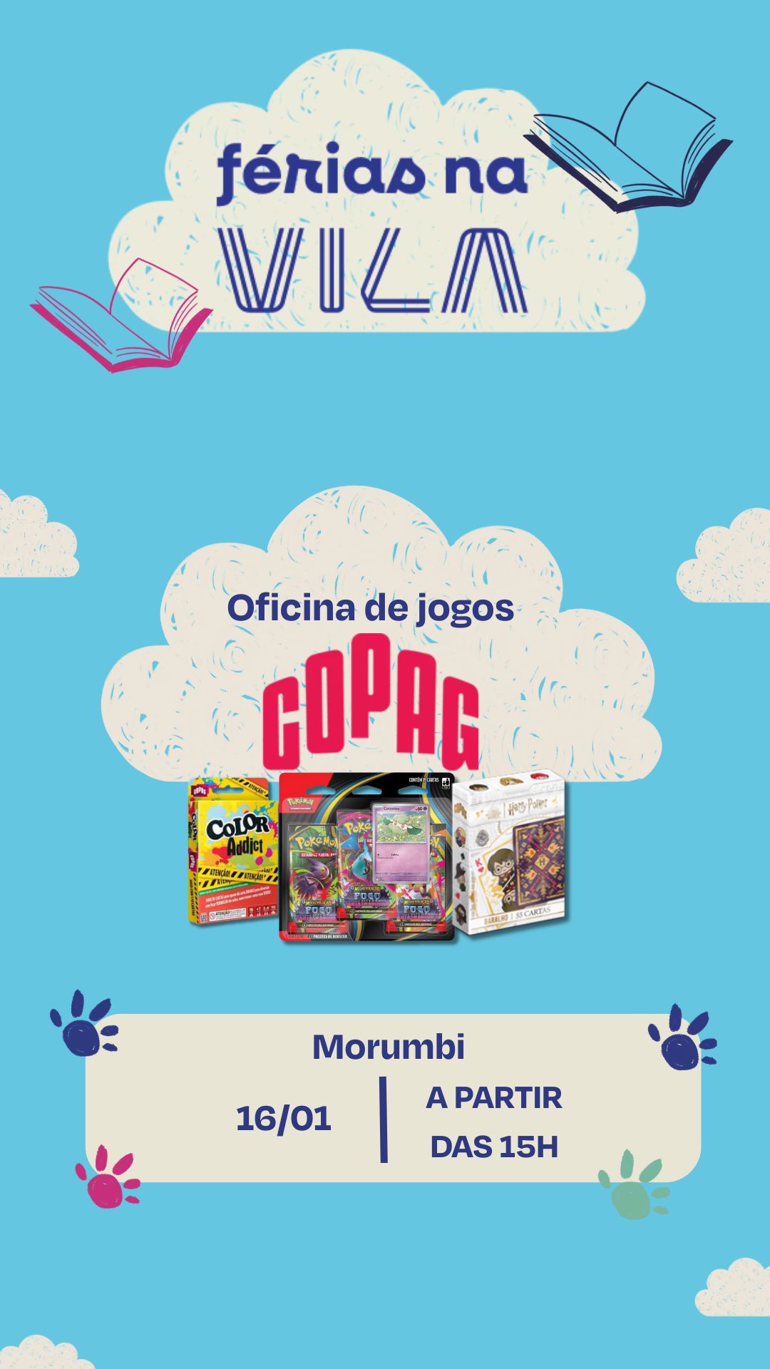 « Todos Eventos Adicionar aos Favoritos 16 de janeiro das 15:00 às 18:00 FÉRIAS NA VILA COM COPAG Oficina de jogos com Copag + Google Agenda+ Exportar iCal Compartilhar Detalhes: Data: 16 de janeiro Hora: 15:00 às 18:00 Telefone: 04707-900 Local: Shopping Morumbi Av. Roque Petroni Júnior, 1089 São Paulo, São Paulo 04833001 Brasil