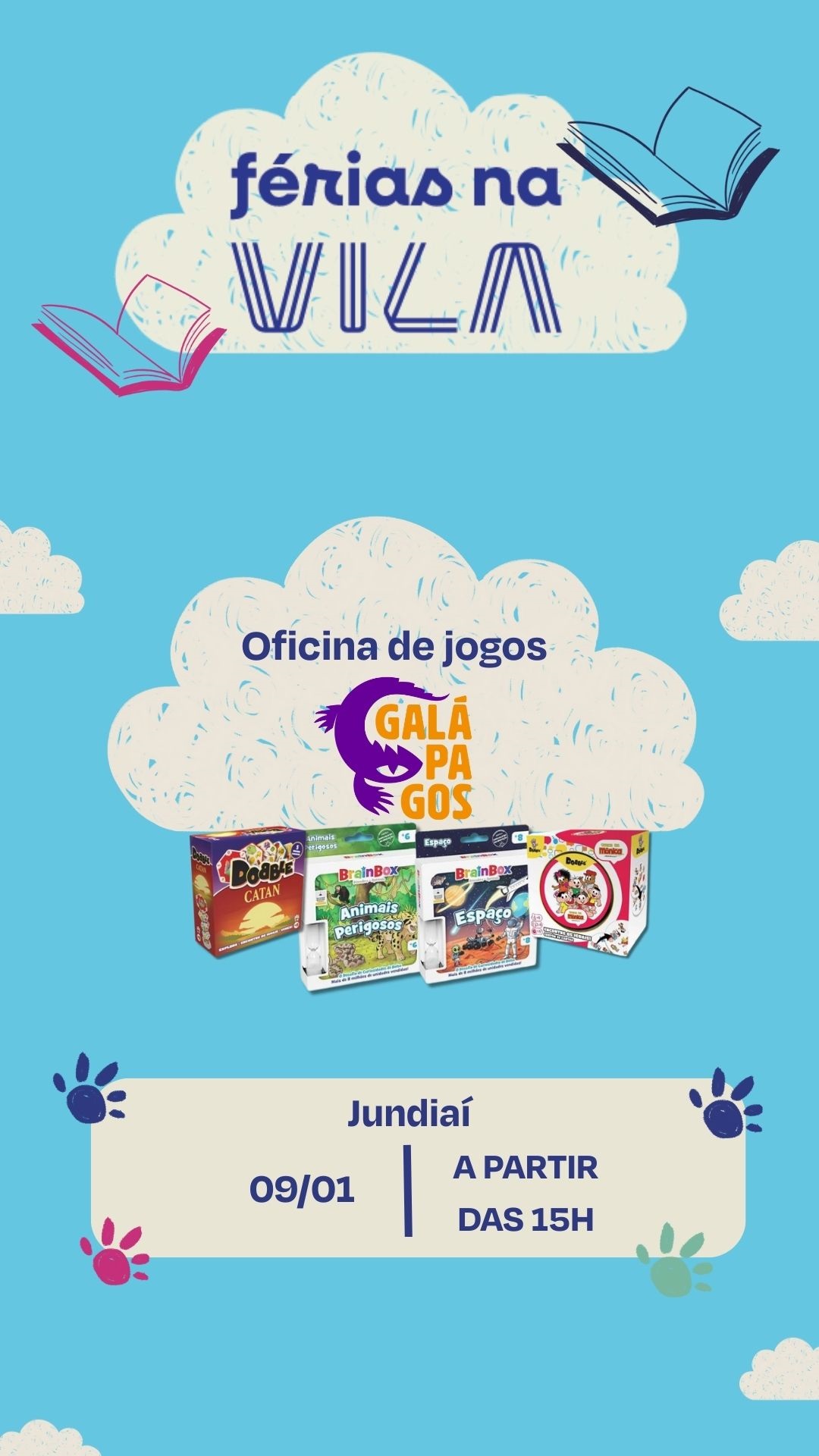 « Todos Eventos Adicionar aos Favoritos 9 de janeiro das 15:00 às 18:00 FÉRIAS NA VILA COM GALÁPAGOS Oficina de jogos com Galápagos + Google Agenda+ Exportar iCal Compartilhar Detalhes: Data: 9 de janeiro Hora: 15:00 às 18:00 Telefone: Local: Jundiaí Shopping Avenida Nove de Julho, 3.333 - Loja L1 Jundiaí, São Paulo 13208-056