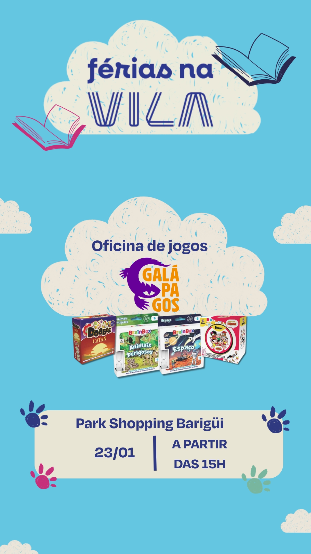 « Todos Eventos Adicionar aos Favoritos 23 de janeiro das 15:00 às 18:00 FÉRIAS NA VILA COM GALÁPAGOS Oficina de jogos com Galápagos + Google Agenda+ Exportar iCal Compartilhar Detalhes: Data: 23 de janeiro Hora: 15:00 às 18:00 Telefone: (41) 3542-4399 Local: Park Shopping Barigüi Rua professor Pedro Viriato Parigot de Souza, 600 - Mossunguê Curitiba, Paraná 81200-100 Brasil