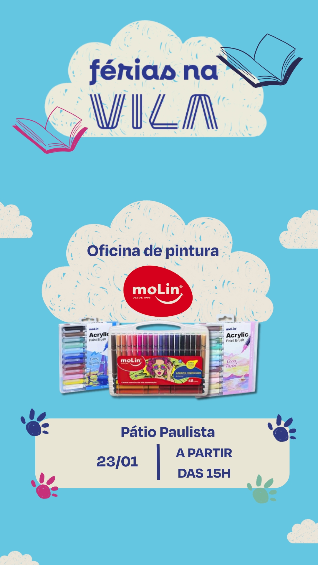 « Todos Eventos Adicionar aos Favoritos Este evento já passou. 23 de janeiro das 15:00 às 18:00 FÉRIAS NA VILA COM MOLIN Oficina de pintura com Molin + Google Agenda+ Exportar iCal Compartilhar Detalhes: Data: 23 de janeiro Hora: 15:00 às 18:00 Telefone: (11) 4210-6902 Local: Shopping Pátio Paulista R. Treze de Maio, 1947 - Bela Vista São Paulo, São Paulo 01327-900