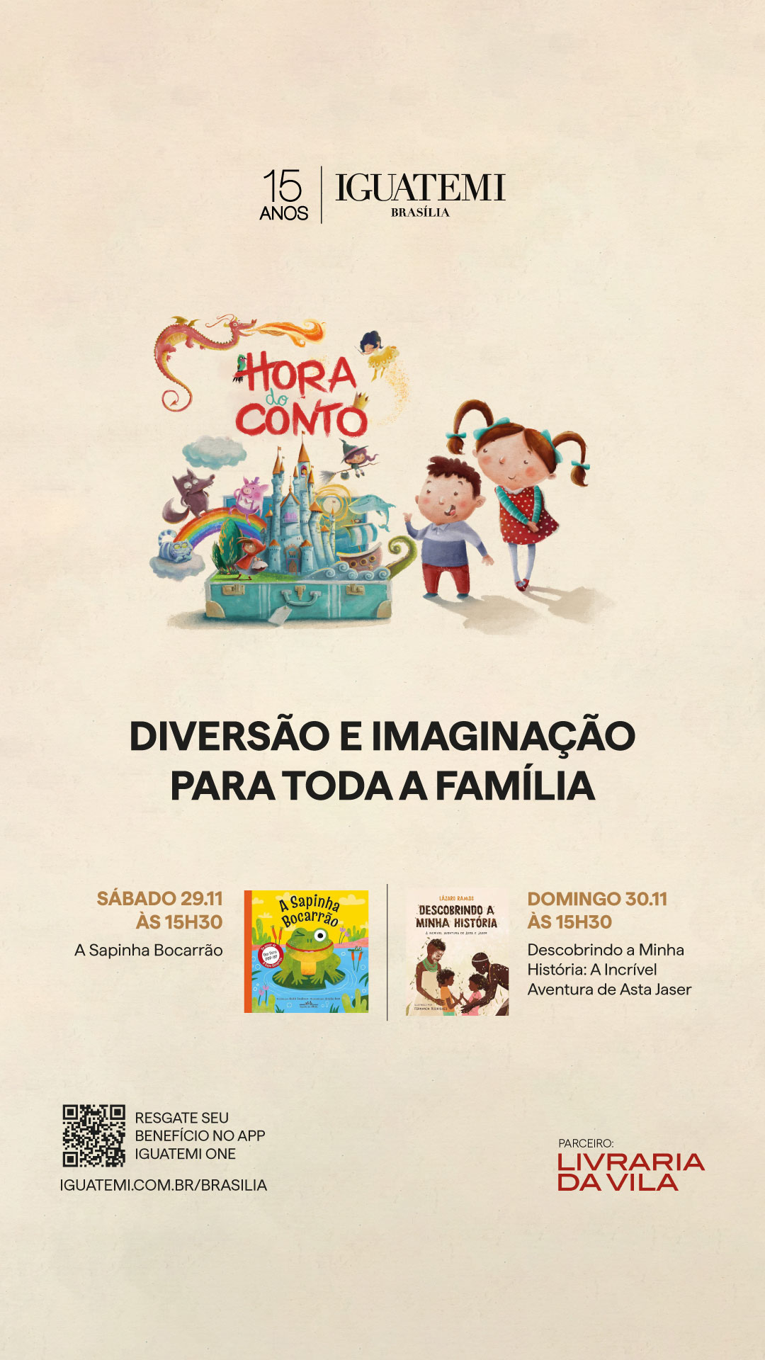 « Todos Eventos Adicionar aos Favoritos Este evento já passou. 29 de novembro das 15:30 às 16:30 HORA DO CONTO COM ANA SOLINO + Google Agenda+ Exportar iCal Compartilhar Detalhes: Data: 29 de novembro Hora: 15:30 às 16:30 Telefone: (61) 4042-8994 Local: Shopping Iguatemi – Brasília SHIN CA 04, BLOCO A Brasília, Distrito federal 71503-504 Brasil