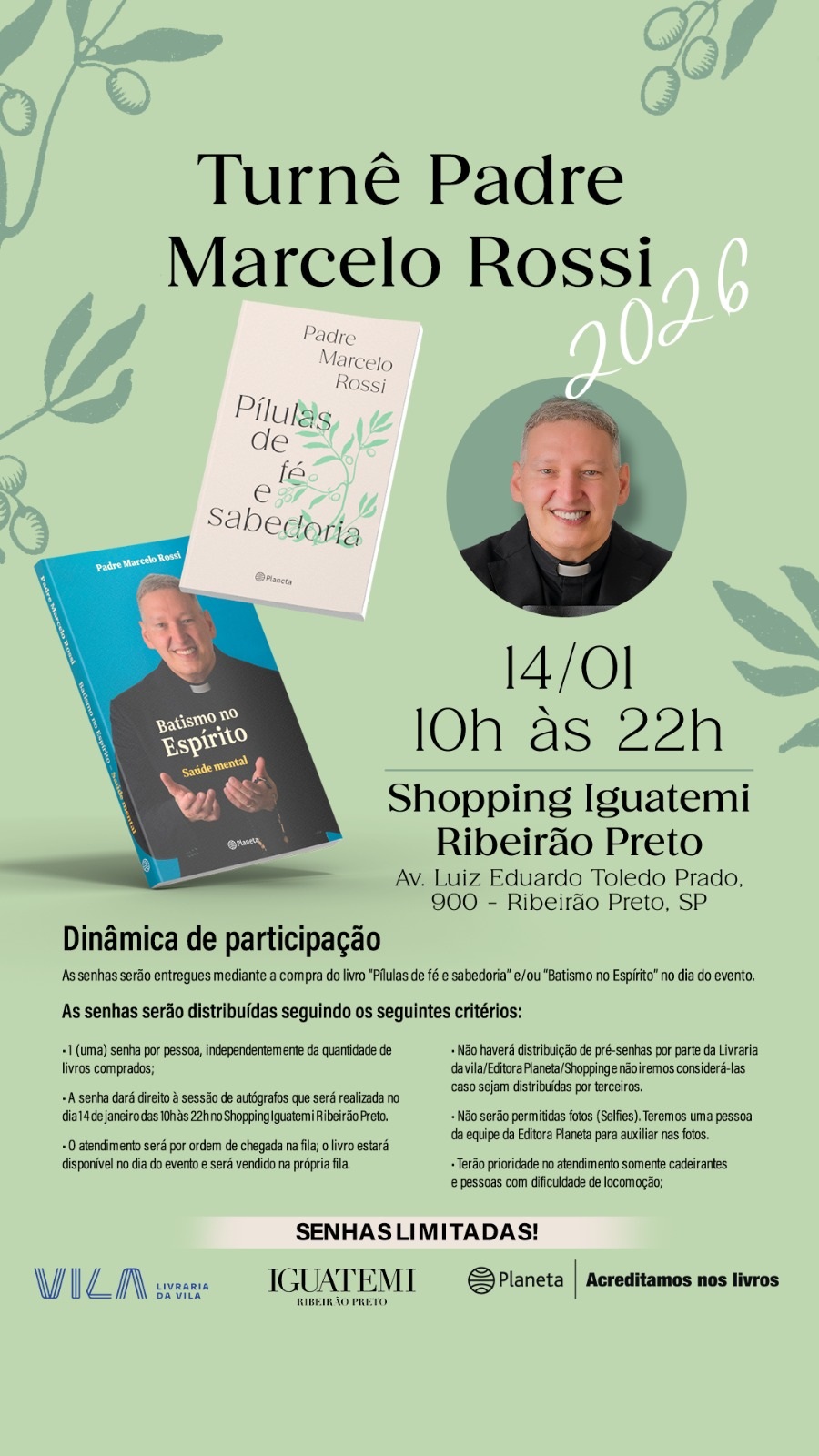 « Todos Eventos Adicionar aos Favoritos 14 de janeiro das 10:00 às 22:00 PÍLULAS DE FÉ E SABEDORIA | BATISMO NO ESPÍRITO – PADRE MARCELO ROSSI – ED. PLANETA (BRASIL) Autor(a): PADRE MARCELO ROSSI Editora: PLANETA (BRASIL) Em Pílulas de fé e sabedoria, Padre Marcelo Rossi convida você a um encontro íntimo com a Palavra de Deus. Mais que uma simples compilação, este livro é o fruto de anos de profunda dedicação às Sagradas Escrituras, um verdadeiro tesouro de versículos que, ao longo de suas recorrentes leituras, tocaram e transformaram a vida do Padre. Com a sensibilidade e a fé que o caracterizam, Padre Marcelo Rossi selecionou cuidadosamente cada “pílula de fé e sabedoria” para oferecer um alento diário, uma reflexão profunda ou um caminho de esperança nos mais diversos momentos da vida. São passagens bíblicas que, como pequenas doses de luz, iluminam a alma e fortalecem o espírito, ajudando a enfrentar desafios, celebrar vitórias e encontrar consolo nas adversidades. Este não é apenas um livro para ser lido, mas para ser meditado. É um guia para quem busca serenidade, inspiração e uma conexão mais profunda com a espiritualidade cristã. Permita que a sabedoria milenar da Bíblia, cuidadosamente pinçada pela experiência de fé do Padre Marcelo Rossi, seja sua companheira constante, uma fonte inesgotável de força e paz em sua jornada. Pílulas de fé e sabedoria é um convite para você nutrir sua fé e descobrir a força transformadora da Palavra Divina, dia após dia. Uma obra essencial para todos que desejam enriquecer sua vida espiritual e encontrar conforto na perene sabedoria dos ensinamentos de Cristo. Você, que padece de alguma condição em sua saúde mental ou que conhece alguém nessa situação, tem em Batismo no Espírito (Saúde Mental) um guia para alcançar a paz por meio da renovação da fé. Neste livro, Padre Marcelo Rossi apresenta um cenário atual de sobrecarga emocional, onde sentimentos como medo, ansiedade e tristeza são comuns. Ele destaca a necessidade de controlar essas emoções por meio da orientação do Espírito Santo e da Palavra de Deus. A leitura das Escrituras é a estrada para a transformação pessoal, essencial para uma vida equilibrada. Em Batismo no Espírito Santo (Saúde Mental) você terá orientação sobre: • Seminário na Vida no Espírito Santo: o batismo no Espírito não é um novo sacramento, mas uma renovação espiritual. • Emoções Negativas: a oração e a meditação na Bíblia são os remédios para enfrentar o medo, a ansiedade, os maus pensamentos, a angústia, a inveja, a mágoa e a depressão. • Poder da Oração: Estudos são citados para mostrar que a leitura frequente da Bíblia está associada à redução de problemas emocionais e comportamentais. Tudo isso torna Batismo no Espírito Santo (Saúde Mental) um guia fundamental para se enfrentar os desafios emocionais da vida e alcançar a cura interior por meio da fé. + Google Agenda+ Exportar iCal Compartilhar Detalhes: Data: 14 de janeiro Hora: 10:00 às 22:00 Telefone: (16) 4042-4112 Local: Shopping Iguatemi – Ribeirão Preto Av.Luiz Eduardo de Toledo Prado, 900 Ribeirão Preto, São Paulo 14027-250 Brasil